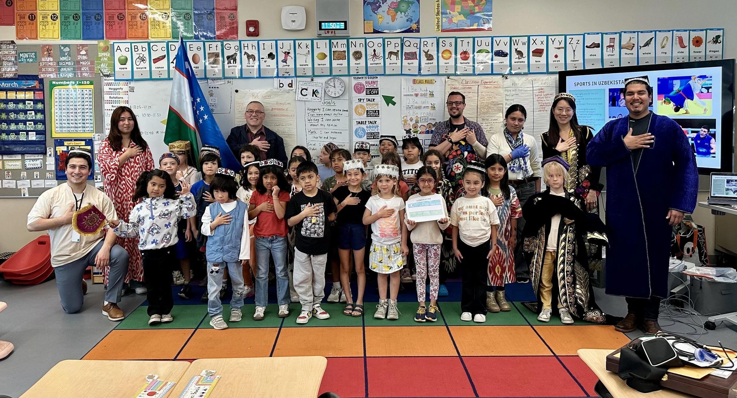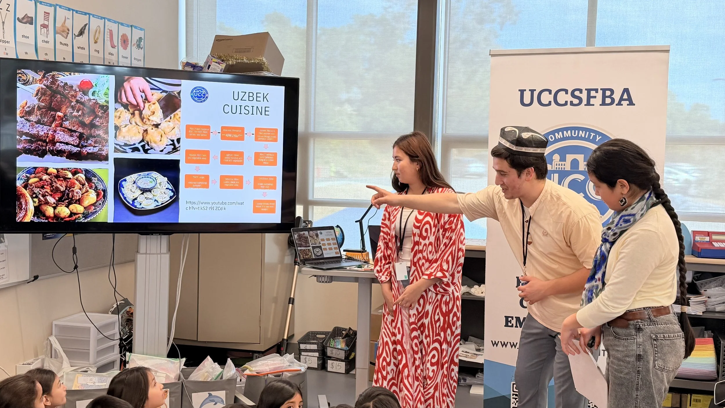 The presentation, hosted in Mx. Nolan Allan's classroom, introduced young students to Uzbekistan's rich heritage. UCCSFBA volunteers Sultonbek Rahimhodjayev, Sabrina Bakhtiyorova, and Kamila Rahimhodjayeva shared fascinating insights about Uzbekistan's geography, population, major cities, diverse landscapes, people, traditional attire, music, art, and cuisine.